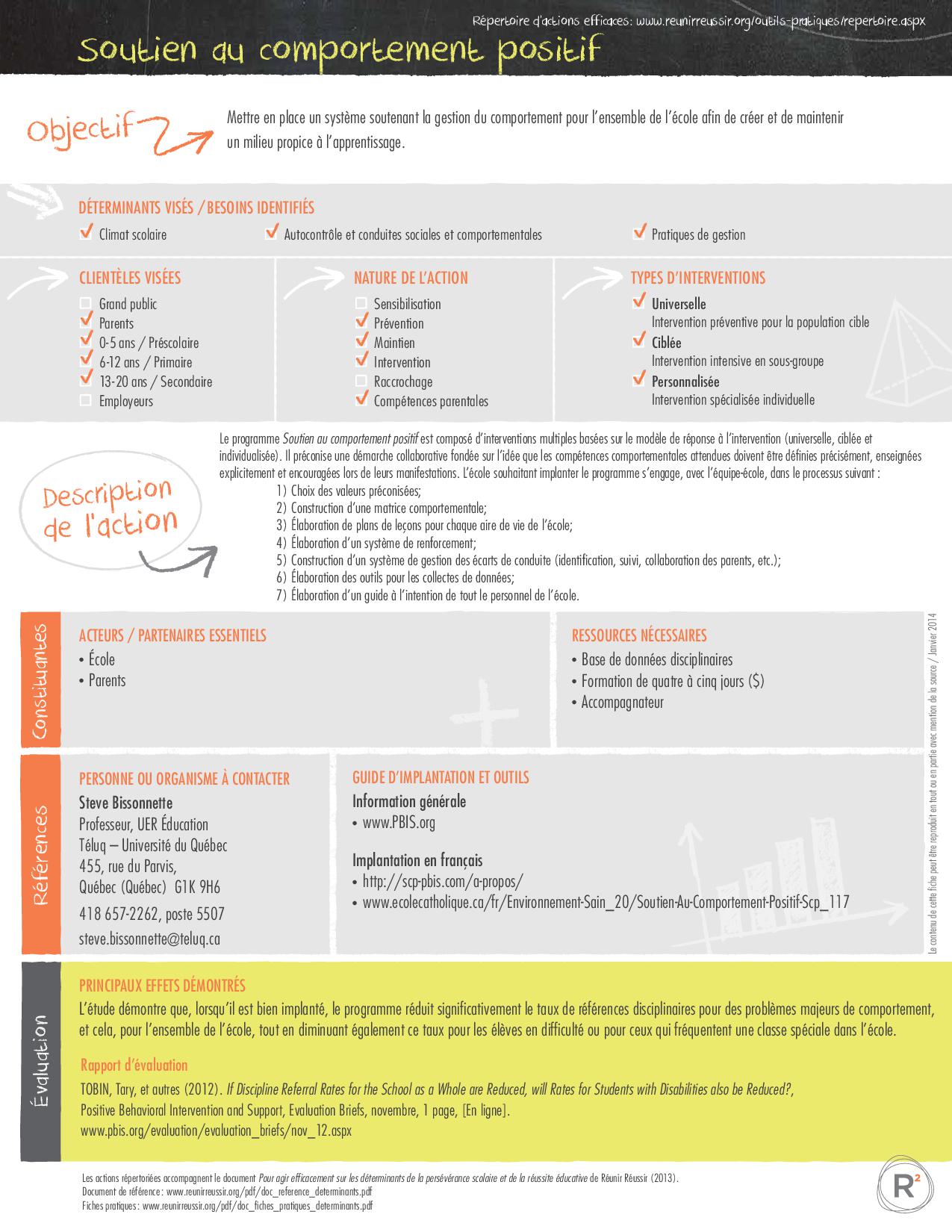 Les actions répertoriées ont été sélectionnées sur la base de résultats d’évaluations démontrant des effets positifs sur la réussite éducative des jeunes ou sur un de ses déterminants. Ces actions proviennent majoritairement du Québec, du reste du Canada et des États-Unis. Chaque fiche-action contient une courte description de l’action, les principaux effets démontrés ainsi que des liens vers les ressources et la documentation afférentes lorsqu’elles sont accessibles en ligne