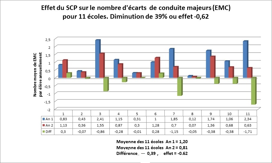 Pour évaluer les effets du système SCP, il importe de calculer dans chacune des écoles participantes le nombre d’écarts de conduite majeurs (ECM) rencontrés au cours d’une année scolaire. Un écart de conduite majeur est un incident disciplinaire qui empêche le professeur d’enseigner et pour lequel l’élève est retiré de classe. Les écoles participantes au projet ne disposant pas d’informations sur les ECM avant l’implantation du SCP, il importe alors de comparer les ECM après un minimum de deux années de mise en oeuvre du système. Il devient ainsi possible de comparer le nombre de ECM de l’an 1 avec l’an 2 et vérifier s’il y a une diminution de ce type d’écart de conduite. Une première évaluation des effets du SCP sur le nombre de ECM dans 11 écoles (primaire n=10, secondaire n=1) au nord de la région montréalaise montre une diminution moyenne de 39% des ECM entre l’an 1 et l’an 2 de mise en oeuvre ou une taille d’effet de -0,62! Bien que le nombre d’écoles soit restreint, ces résultats préliminaires sont positifs et très encourageants!