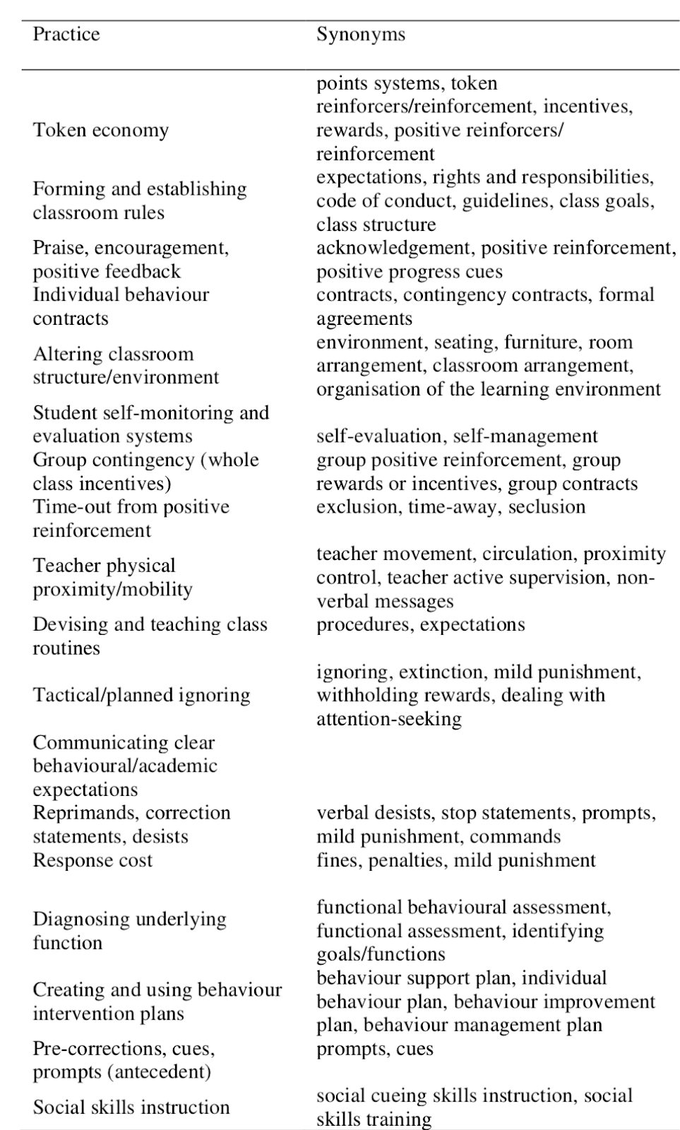 Dans l’article de revue de Sue O’Neil, celle-ci a réalisé une liste de dix-huit pratiques liées à la gestion de classe et du comportement qui bénéficient d’un soutien de la recherche.
