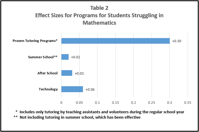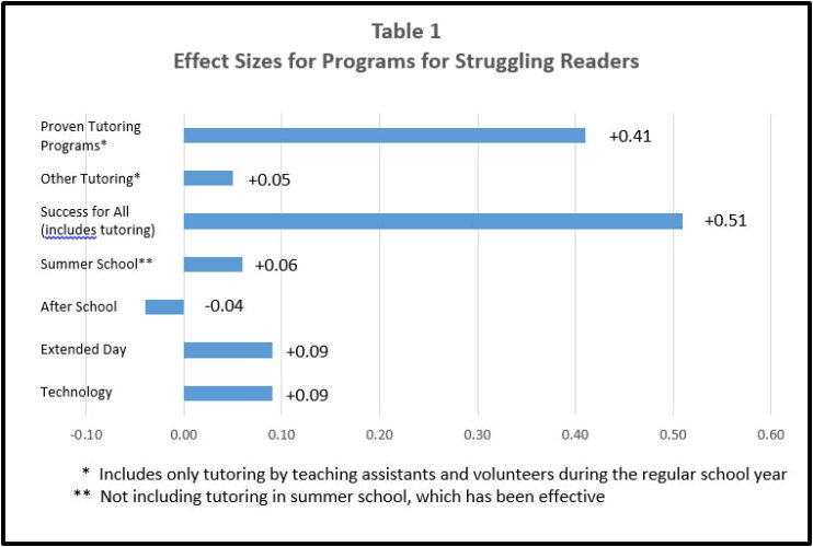 Voir le dernier article de Robert Slavin. On peut voir le peu d’effet des programmes de tutorat maison et ceux faits après l’école!