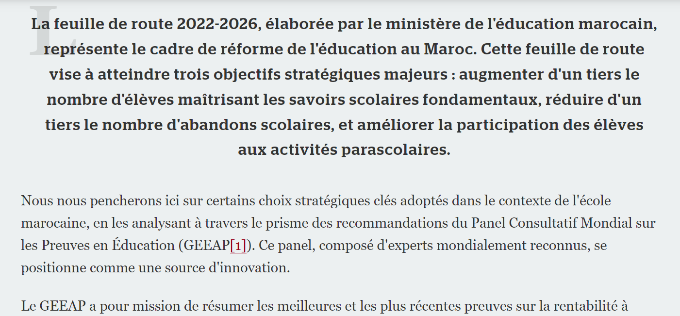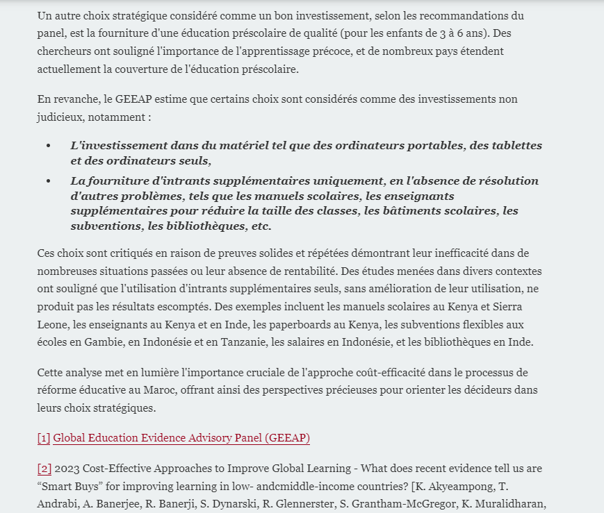 Voir ici: https://medias24.com/chronique/optimiser-leducation-au-maroc-analyse-des-choix-strategiques-a-la-lumiere-de-lapproche-cout-efficacite/